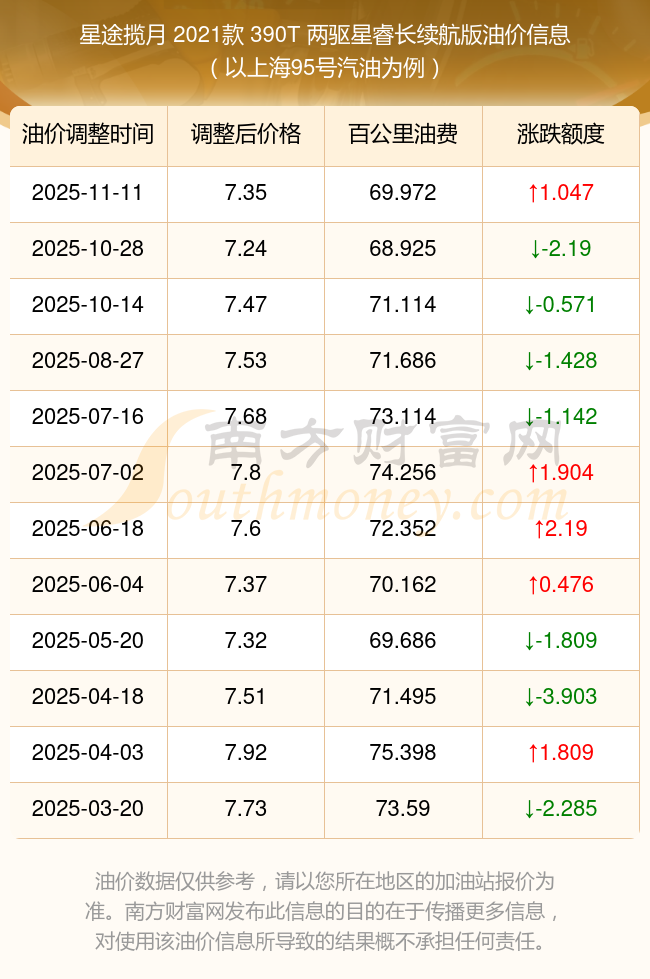 依照11月11日95號汽油最新調整價格7.35元/升來計算(以上海為例),該車型百公里的平均油費是69.972元,依照上一輪10月28日調整價格7.24元/升來計算,百公里的平均油費是68.925元,對比上一輪多花1.047元,下一輪的油價調整時間11月24日24時。