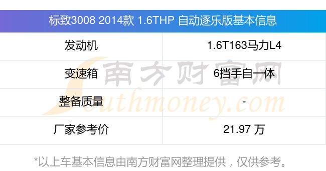 在動力方面,標(biāo)致3008 2014款 1.6THP 自動逐樂版搭載的是一臺1.6T163馬力L4渦輪增壓發(fā)動機(jī),匹配6擋手自一體自動檔變速箱,燃料形式為汽油,廠家參考價21.97萬元。