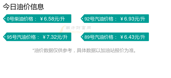油價(jià)數(shù)據(jù)僅供參考,請(qǐng)以您所在地區(qū)的加油站報(bào)價(jià)為準(zhǔn)。南方財(cái)富網(wǎng)發(fā)布此信息的目的在于傳播更多信息,對(duì)使用該油價(jià)信息所導(dǎo)致的結(jié)果概不承擔(dān)任何責(zé)任。