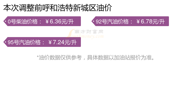 11月15日,呼和浩特新城區(qū)汽油、柴油每升最新價格:調整時間為11月11日,92號汽油為6.88元,上升了0.1元,上升幅達1.48%;95號汽油為7.34元,上升了0.1元,上升幅達1.38%;0號柴油為6.46元,上升了0.1元,上升幅達1.57%。