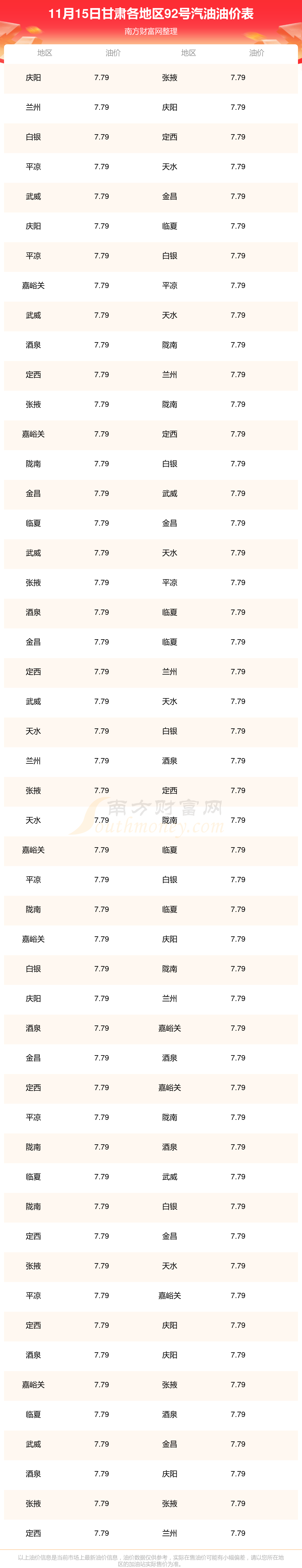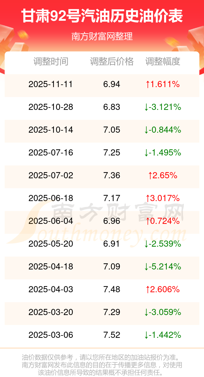 甘肅92號汽油11月15日價格為6.94元每升,本次油價調(diào)整時間是11月11日,相對上次調(diào)整后10月28日的油價是6.83元/升,上調(diào)了0.11元,上調(diào)幅為1.611%。