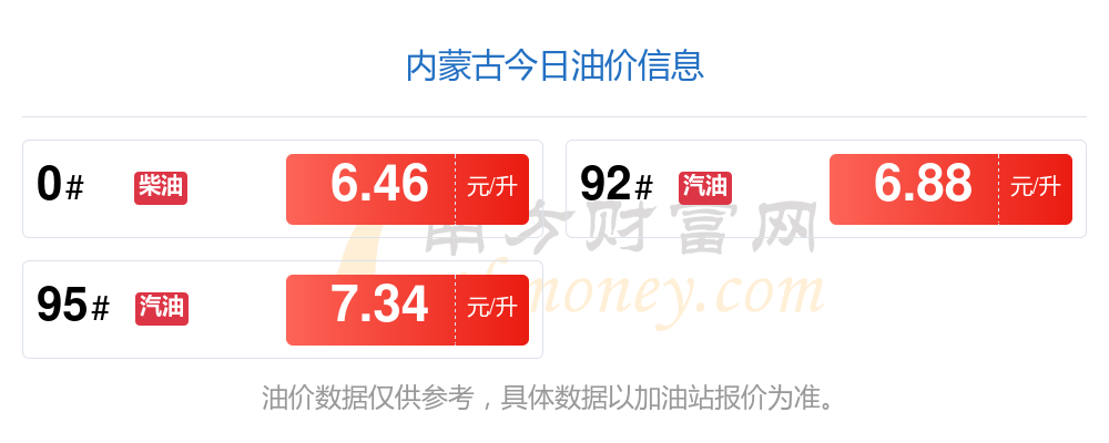 11月15日內(nèi)蒙古通遼92號(hào)汽油的價(jià)格為11月11日調(diào)整后的價(jià)格,具體為:6.88元每升,相對(duì)上次調(diào)整時(shí)間10月28日的油價(jià)6.78元每升,增了0.1元,增幅達(dá)1.475%。下一輪油價(jià)調(diào)整時(shí)間11月24日24時(shí),距離現(xiàn)在還有9.65天。