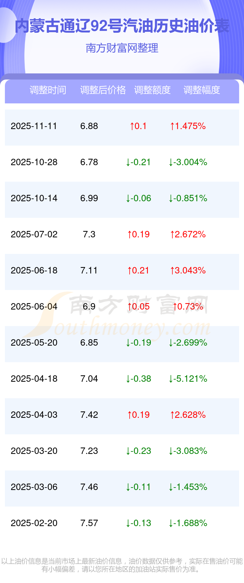 2025年92號(hào)汽油價(jià)格調(diào)整一覽表