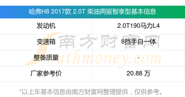 哈弗H8 2017款 2.0T 柴油兩驅(qū)智享型動(dòng)力方面,搭載的是一臺(tái)2.0T190馬力L4雙渦輪增壓發(fā)動(dòng)機(jī),匹配8擋手自一體自動(dòng)檔變速箱,燃料形式為柴油,廠家參考價(jià)20.88萬元。