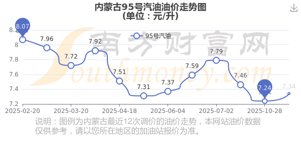 11月15日,內(nèi)蒙古95號汽油的價格是7.34元每升,本次的調(diào)整時間為11月11日,對比上次的調(diào)整上調(diào)了0.1元,上調(diào)1.381%,11月24日24時為下一輪油價調(diào)整時間,還有9.65天。