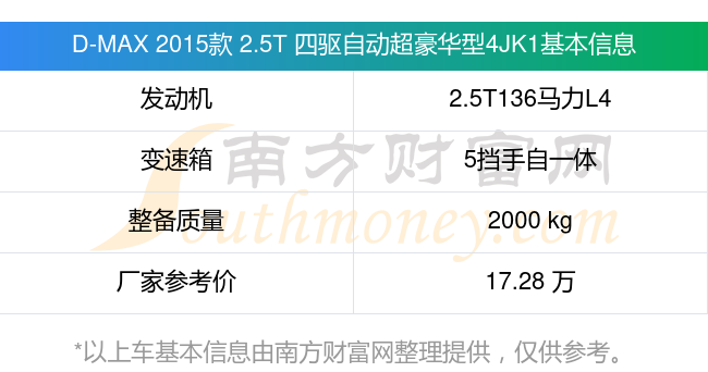 D-MAX 2015款 2.5T 四驅(qū)自動(dòng)超豪華型4JK1動(dòng)力上配備的是一臺(tái)2.5T136馬力L4渦輪增壓發(fā)動(dòng)機(jī),匹配的是5擋手自一體自動(dòng)檔變速箱,燃料形式為柴油,常規(guī)整備質(zhì)量2000kg,廠家參考價(jià)17.28萬元。