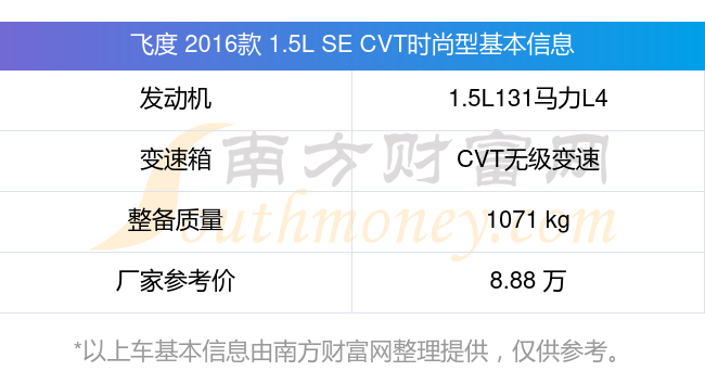 在動力上,飛度 2016款 1.5L SE CVT時尚型配備的是一臺1.5L131馬力L4自然吸氣發(fā)動機,匹配的是CVT無級變速自動檔變速箱,燃料形式為汽油,常規(guī)整備質量1071kg,廠家參考價8.88萬元。