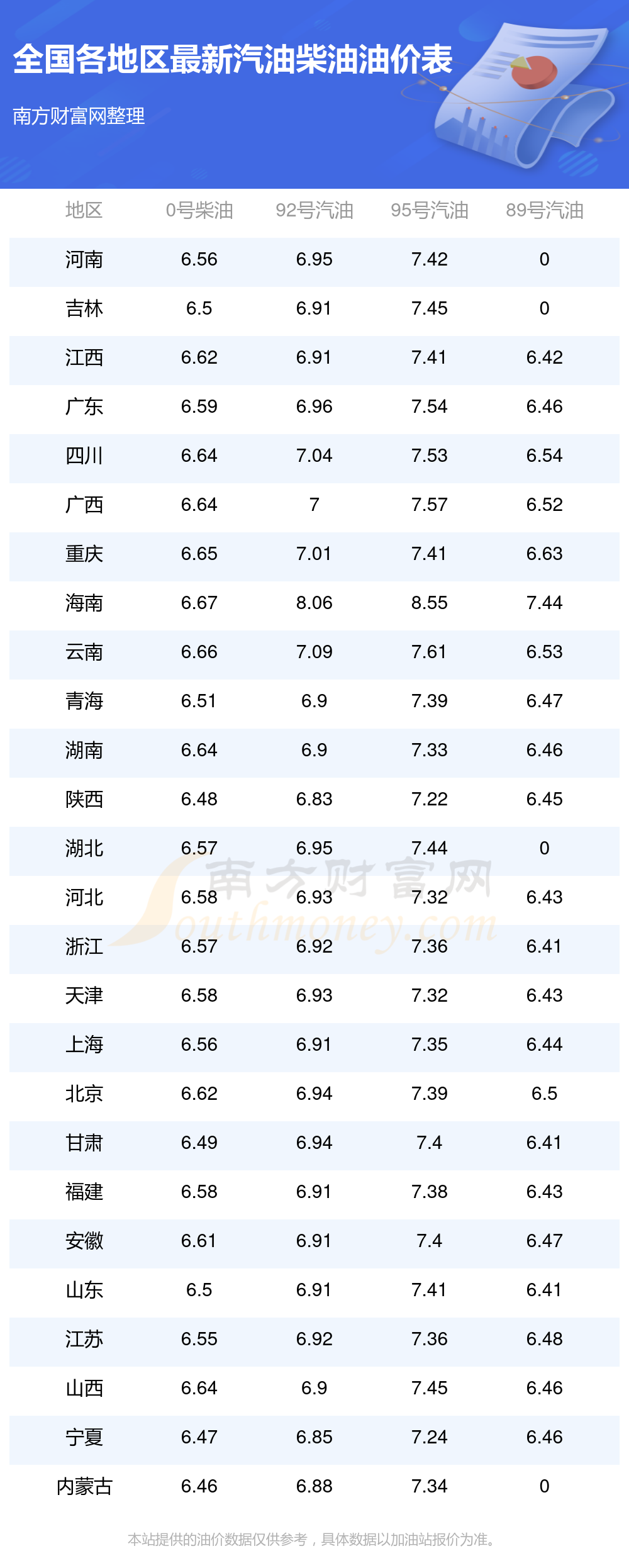 全國各地區(qū)最新油價表