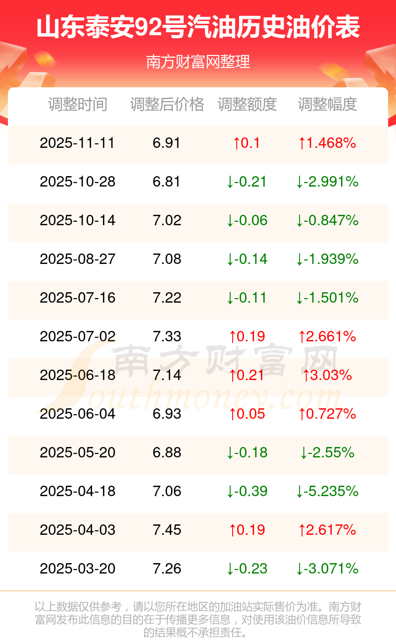 11月15日山東泰安92號汽油的價格為11月11日油價調(diào)整后的價格,具體是每升6.91元,相對上次調(diào)整時間10月28日的油價6.81元每升,共升了0.1元,升1.468%。下一輪油價調(diào)整時間11月24日24時,距離現(xiàn)在還有9.61天。