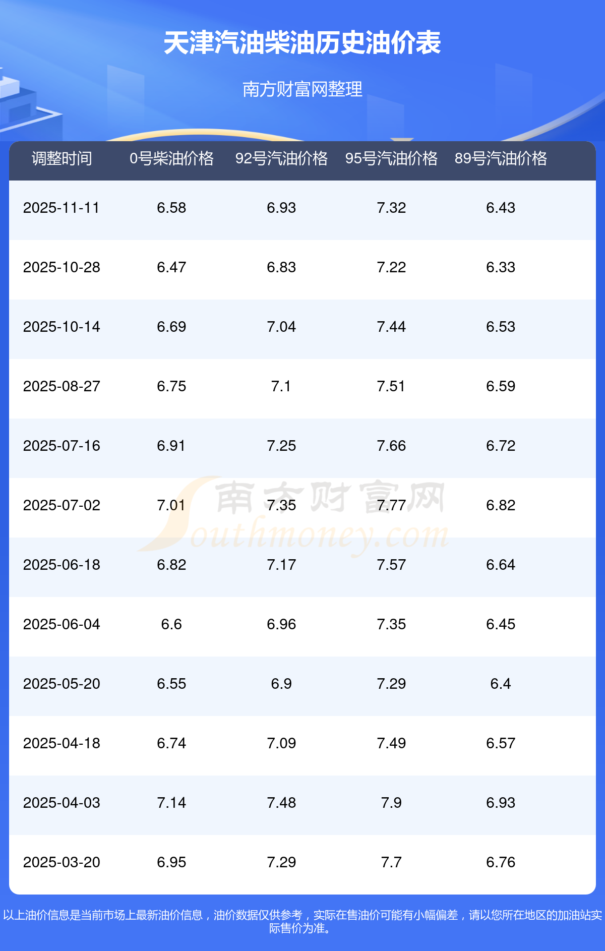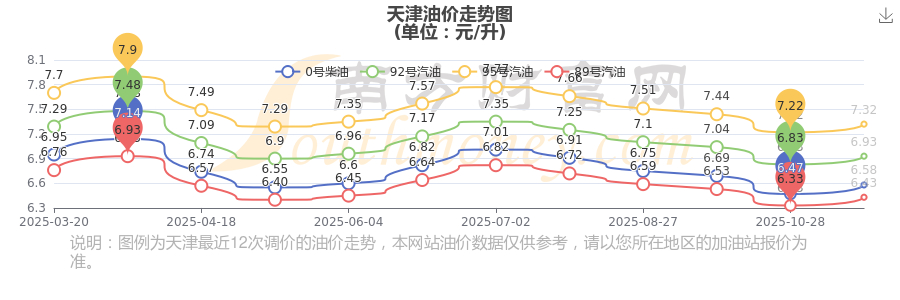 11月15日天津汽油、柴油的價(jià)格是11月11日調(diào)整后的價(jià)格,每升價(jià)格為:92號(hào)汽油為6.93元,上漲了0.1元,上漲幅達(dá)1.46%;95號(hào)汽油為7.32元,上漲了0.1元,上漲幅達(dá)1.39%;89號(hào)汽油為6.43元,上漲了0.1元,上漲幅達(dá)1.58%;0號(hào)柴油為6.58元,上漲了0.11元,上漲幅達(dá)1.7%。