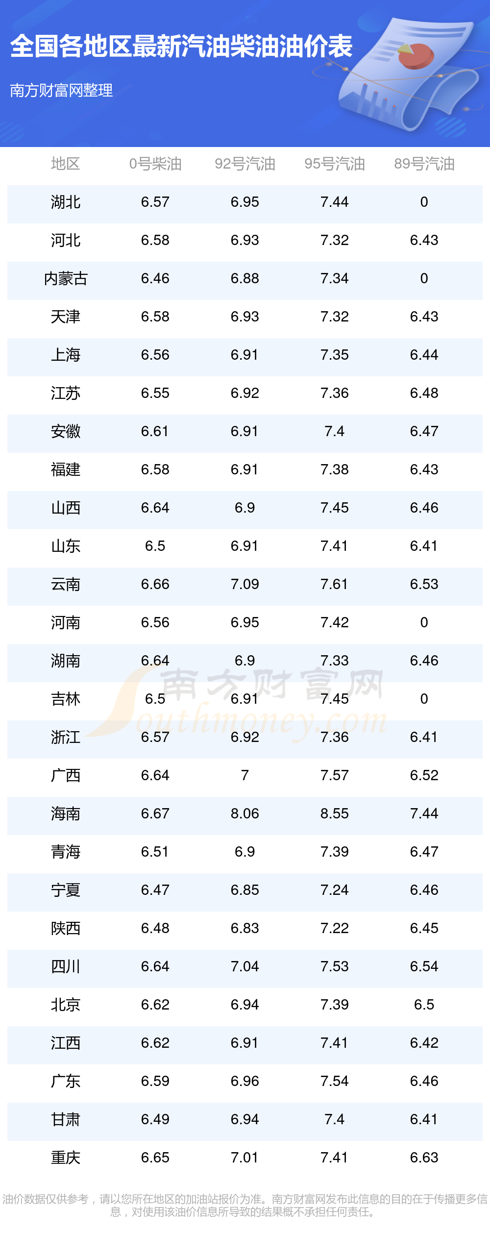95號汽油平均價格:7元每升,其中,最高為海南,價格8.55元/升,最低為陜西,價格7.22元/升。