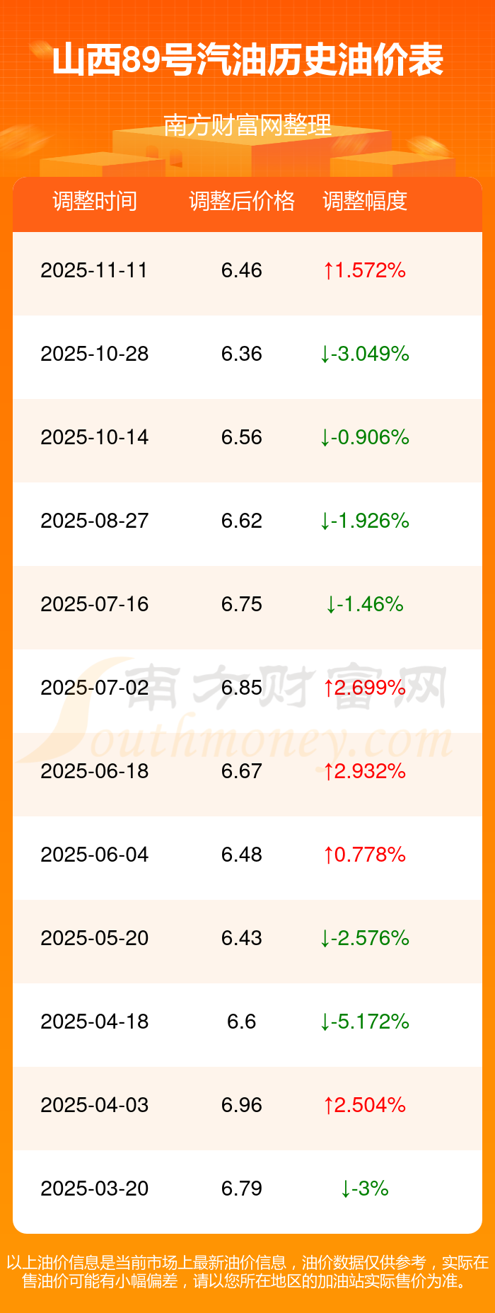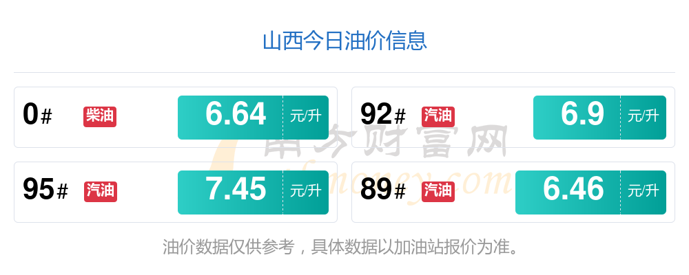 11月15日,山西89號汽油的價格是6.46元每升,本次的調整時間為11月11日,對比上次的調整增了0.1元,增1.572%,下次調整時間為11月24日24時,還有9.6天。