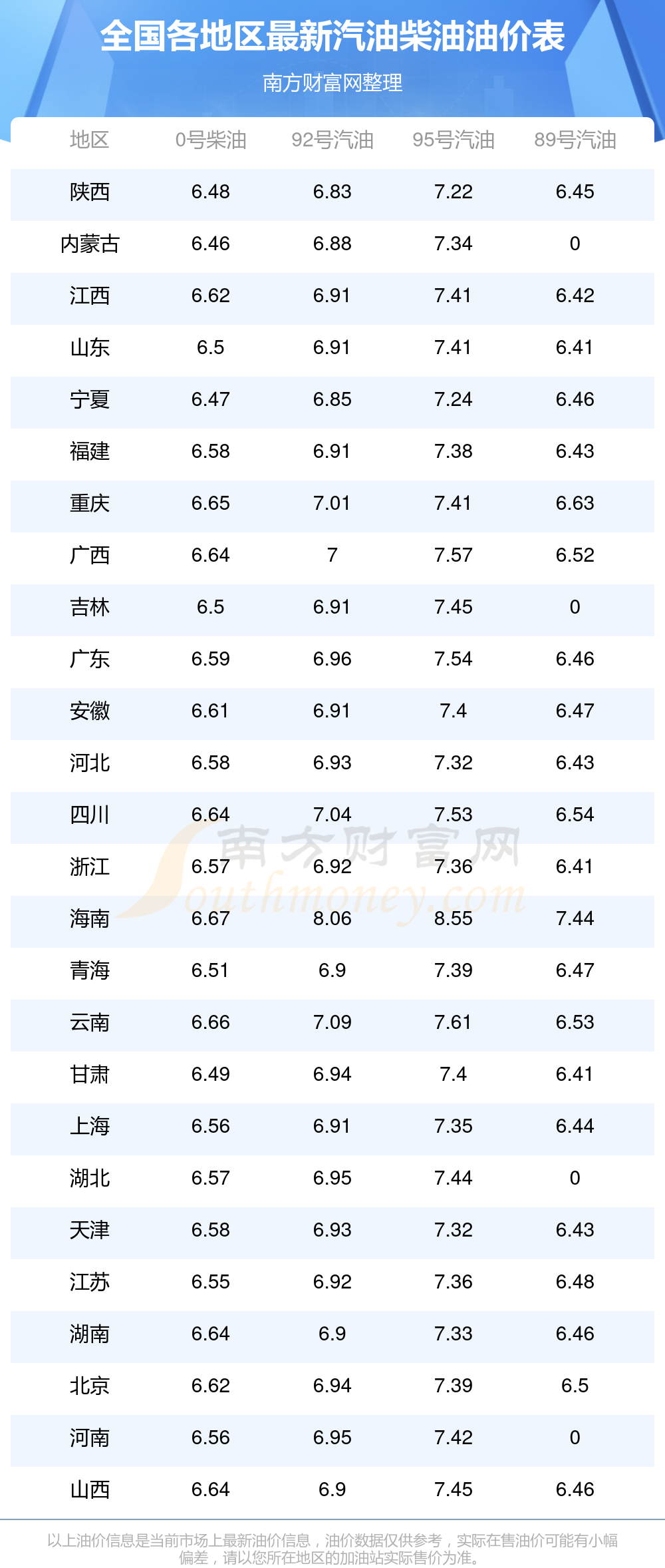 0號(hào)柴油平均價(jià)格:7元每升,其中,最高為海南,價(jià)格為6.67元/升,最低為內(nèi)蒙古,價(jià)格為6.46元/升。