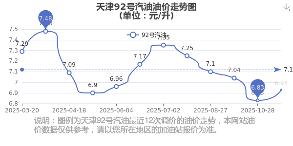 11月15日天津汽油、柴油價(jià)格是多少錢一升?11月11日調(diào)整后,92號汽油為6.93元,漲了0.1元,漲幅達(dá)1.46%;95號汽油為7.32元,漲了0.1元,漲幅達(dá)1.39%;89號汽油為6.43元,漲了0.1元,漲幅達(dá)1.58%;0號柴油為6.58元,漲了0.11元,漲幅達(dá)1.7%。下一輪油價(jià)調(diào)整時(shí)間11月24日24時(shí),距離現(xiàn)在還有9.6天。