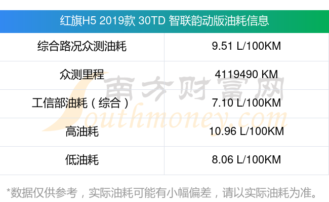 根據(jù)車主實測數(shù)據(jù),該車型低油耗為8.06升/百公里,高油耗為10.96升/百公里,綜合路況眾測油耗為9.51升/百公里,工信部綜合油耗為7.10升/百公里。