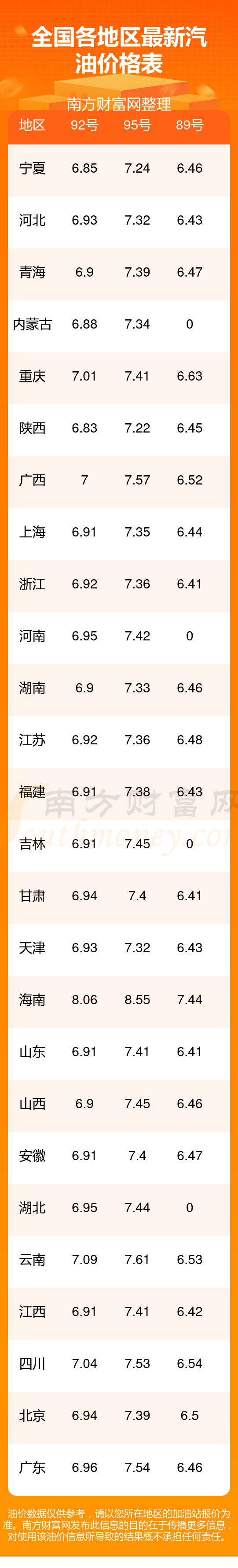 附:最新全國汽油、柴油價格一覽表