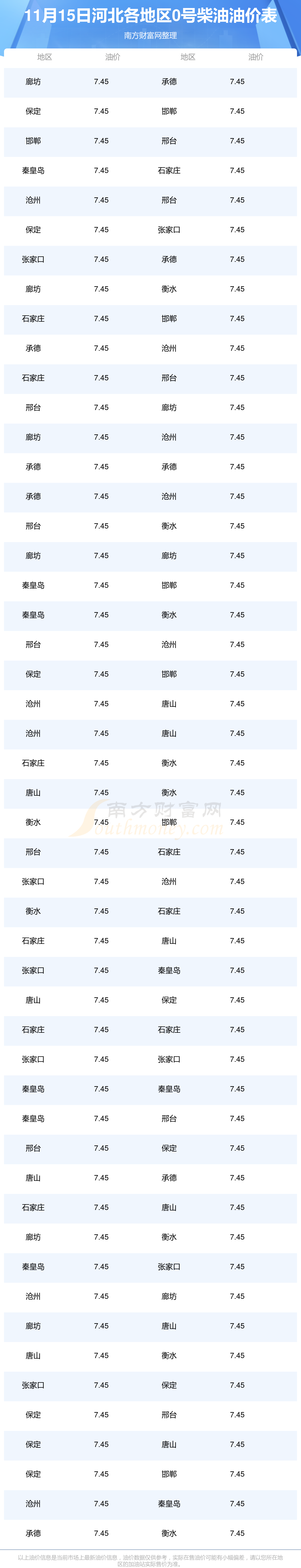 以上數(shù)據(jù)僅供參考,請以您所在地區(qū)的加油站實際售價為準。南方財富網(wǎng)發(fā)布此信息的目的在于傳播更多信息,對使用該油價信息所導致的結(jié)果概不承擔責任。