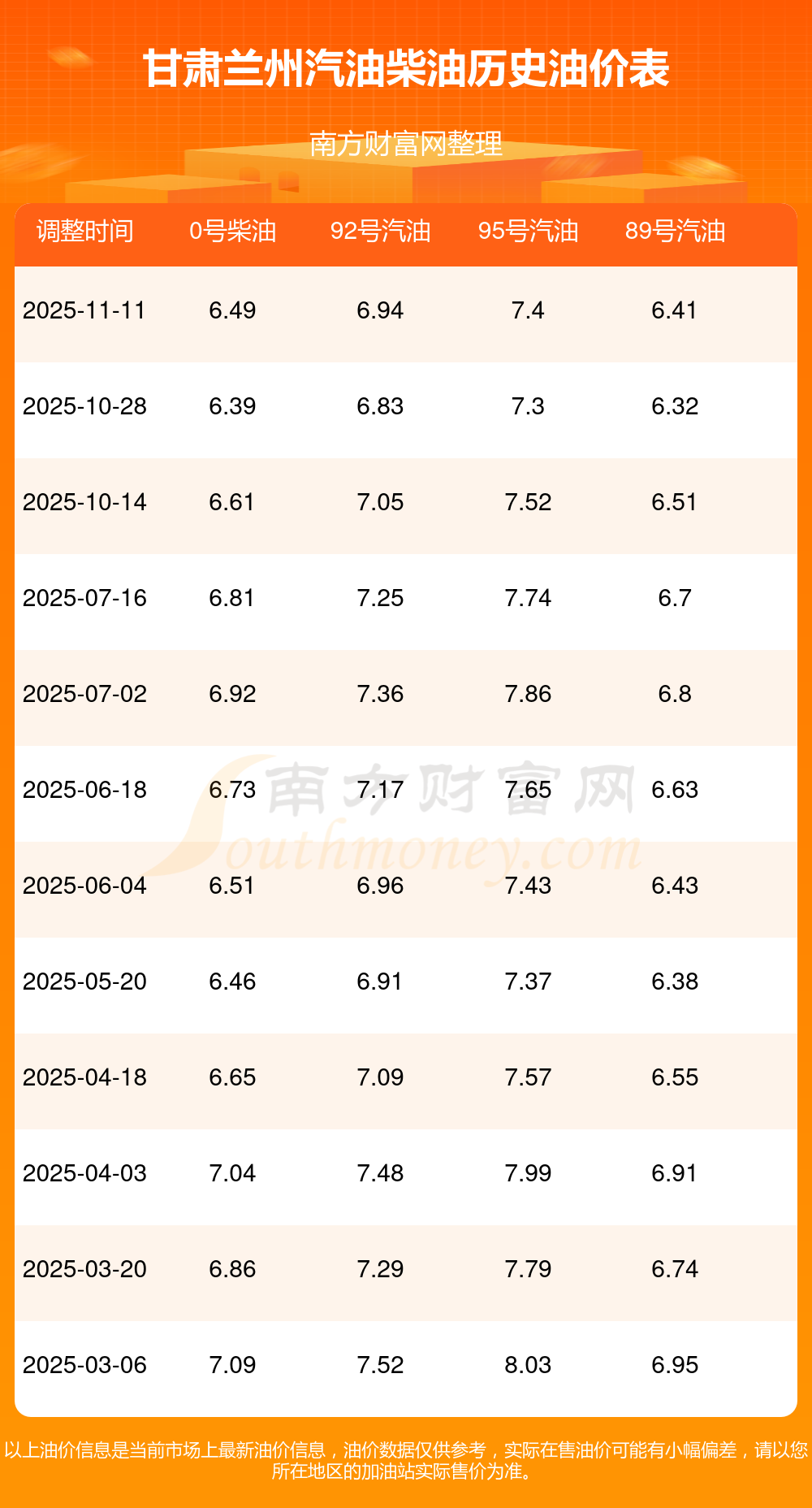 甘肅蘭州汽油、柴油11月15日每升的價格具體是(11月11日調(diào)整后的價格):92號汽油6.94元;95號汽油7.4元;89號汽油6.41元;0號柴油6.49元。