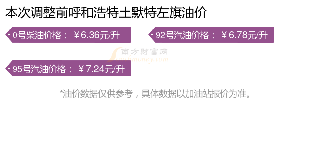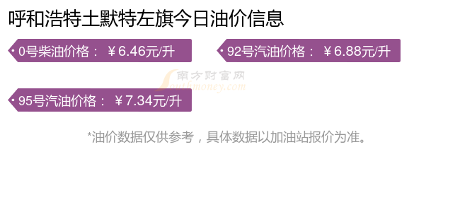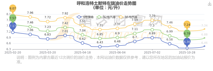 11月15日,呼和浩特土默特左旗汽油、柴油每升的價格為11月11日調(diào)整后的價格,具體為:92號汽油為6.88元,升了0.1元,升幅達1.48%;95號汽油為7.34元,升了0.1元,升幅達1.38%;0號柴油為6.46元,升了0.1元,升幅達1.57%。