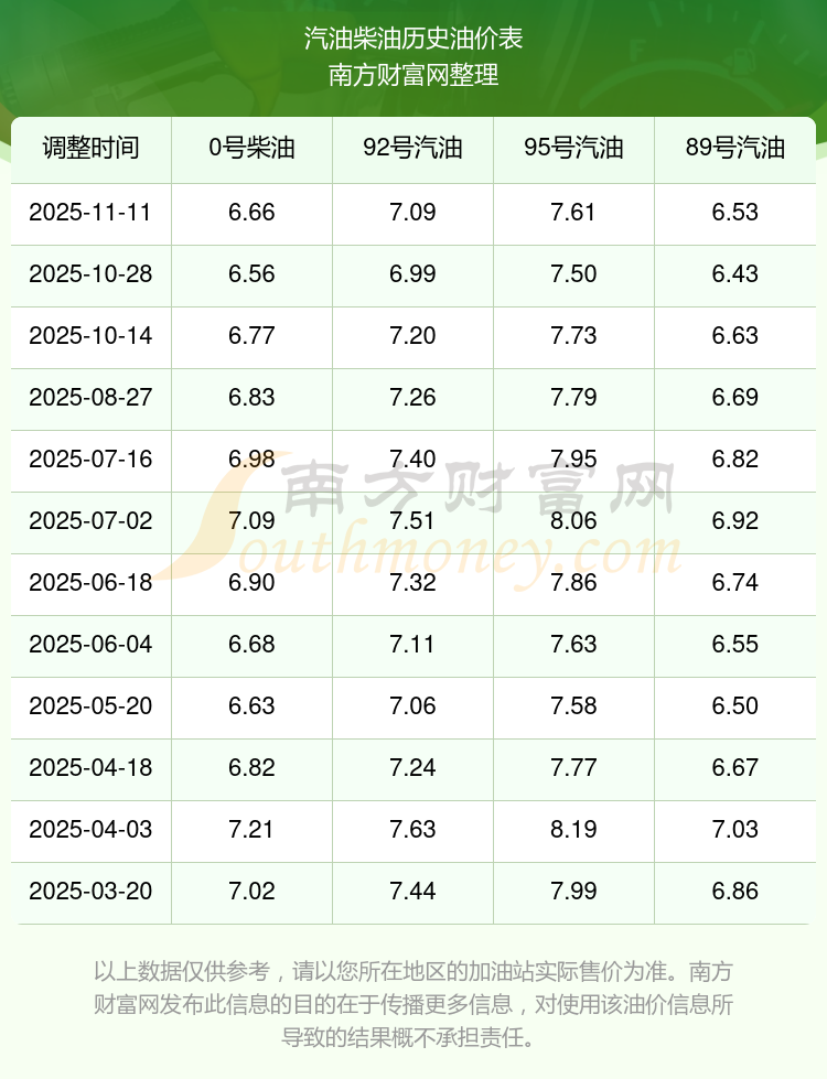 2025年95號汽油價格一覽表