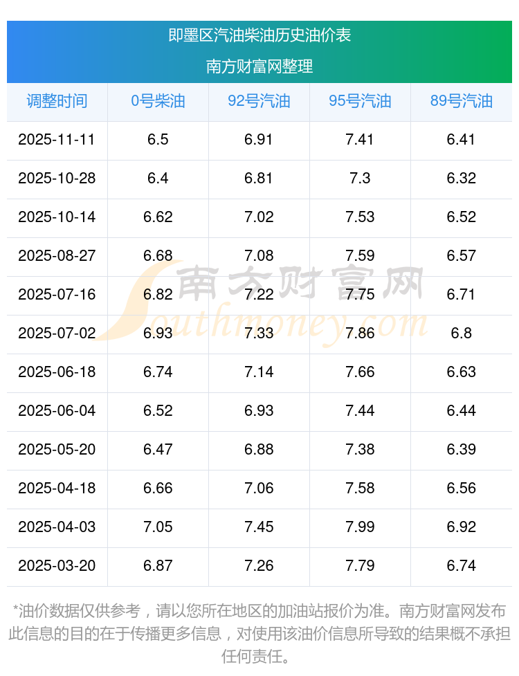 以上數(shù)據(jù)僅供參考,請(qǐng)以您所在地區(qū)的加油站實(shí)際售價(jià)為準(zhǔn)。南方財(cái)富網(wǎng)發(fā)布此信息的目的在于傳播更多信息,對(duì)使用該油價(jià)信息所導(dǎo)致的結(jié)果概不承擔(dān)責(zé)任。