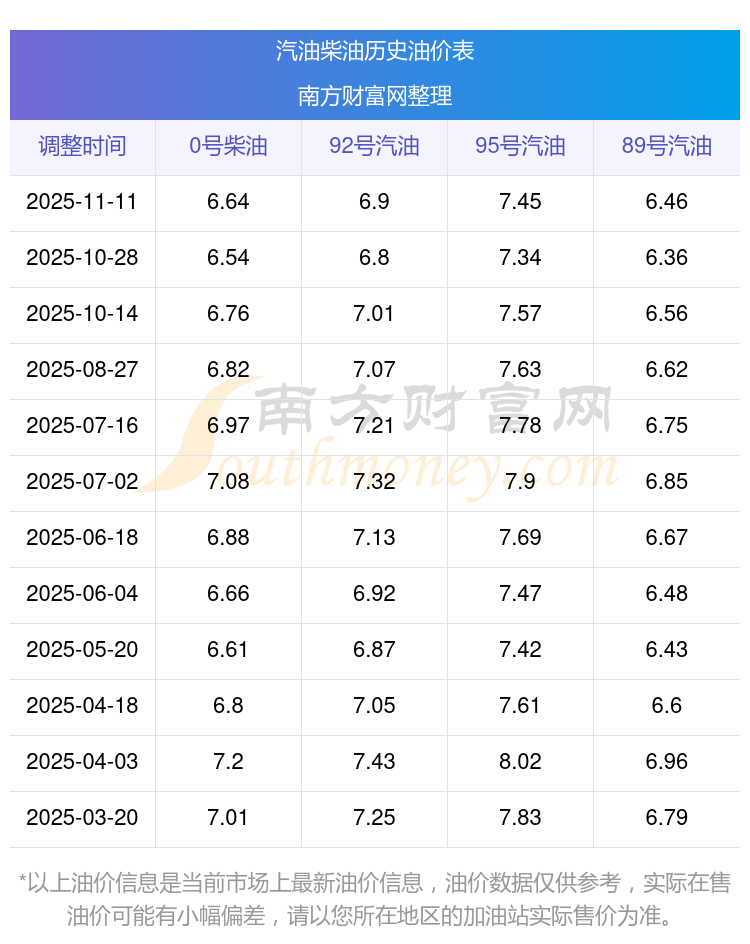 山西晉城92號汽油11月15日的價格為11月11日調整后的價格,具體為6.9元/升,相對上次調整漲了0.1元。下一輪油價調整時間11月24日24時,距離現(xiàn)在還有9.57天。