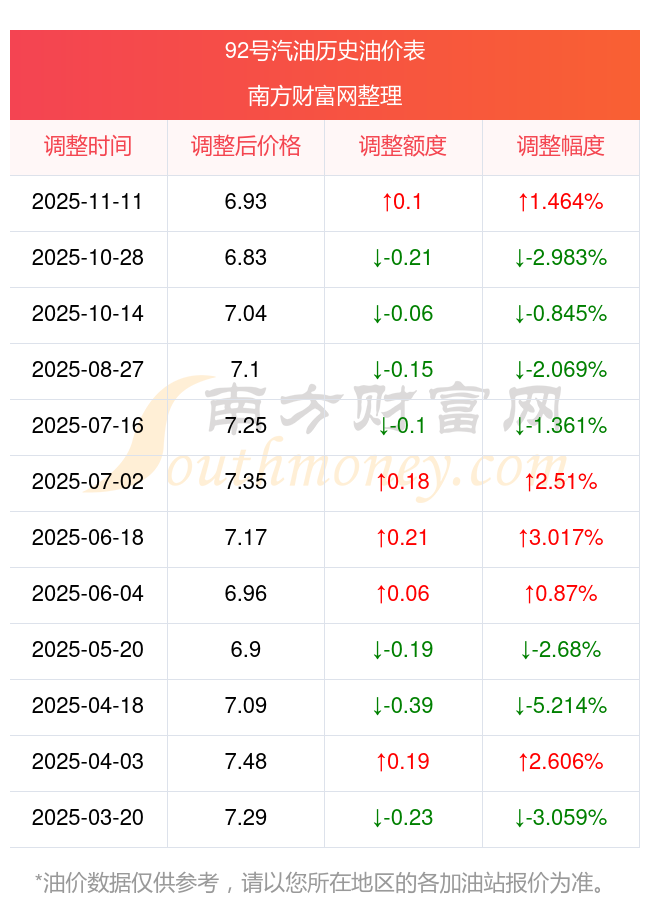 11月15日,汽油、柴油每升最新價(jià)格:調(diào)整時(shí)間為11月11日,92號(hào)汽油為6.93元,上升了0.1元,上升幅達(dá)1.46%;95號(hào)汽油為7.32元,上升了0.1元,上升幅達(dá)1.39%;89號(hào)汽油為6.43元,上升了0.1元,上升幅達(dá)1.58%;0號(hào)柴油為6.58元,上升了0.11元,上升幅達(dá)1.7%。下一輪油價(jià)調(diào)整時(shí)間11月24日24時(shí),距離現(xiàn)在還有9.57天。