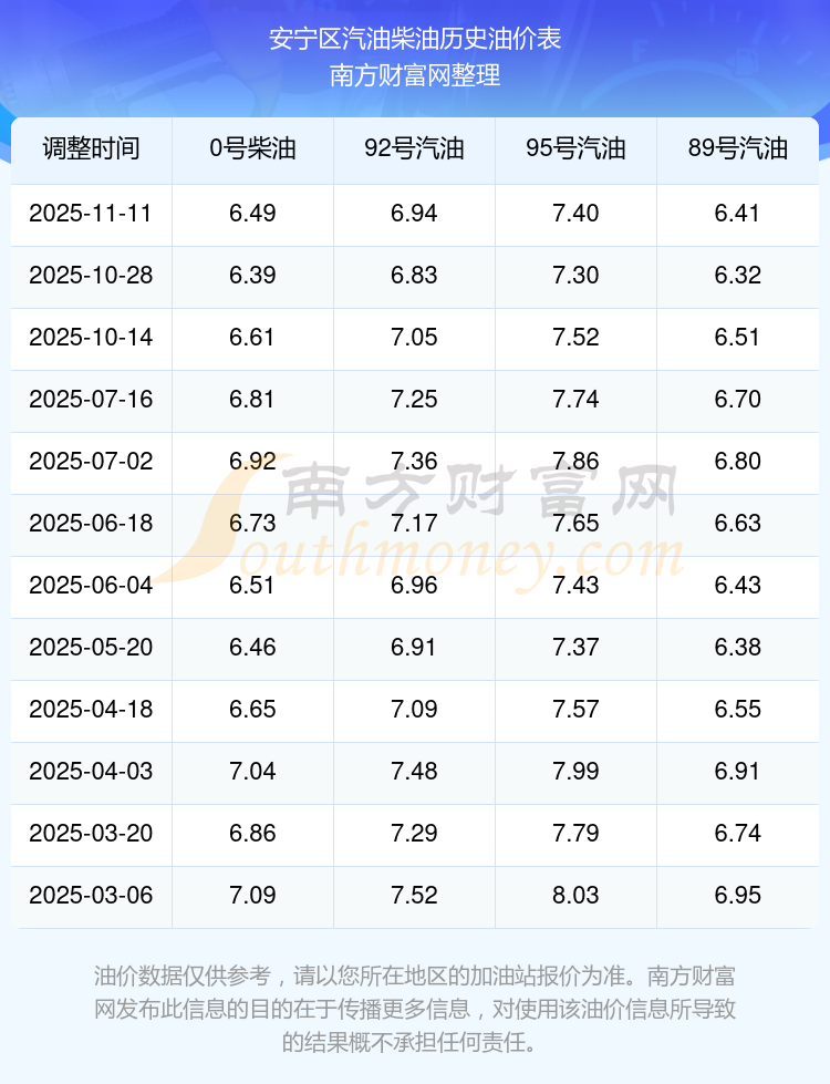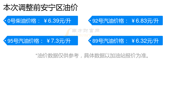 安寧區(qū)汽油、柴油11月15日每升最新價(jià)格:92號(hào)汽油為6.94元;95號(hào)汽油為7.4元;89號(hào)汽油為6.41元;0號(hào)柴油為6.49元,本輪油價(jià)調(diào)整時(shí)間為11月11日。