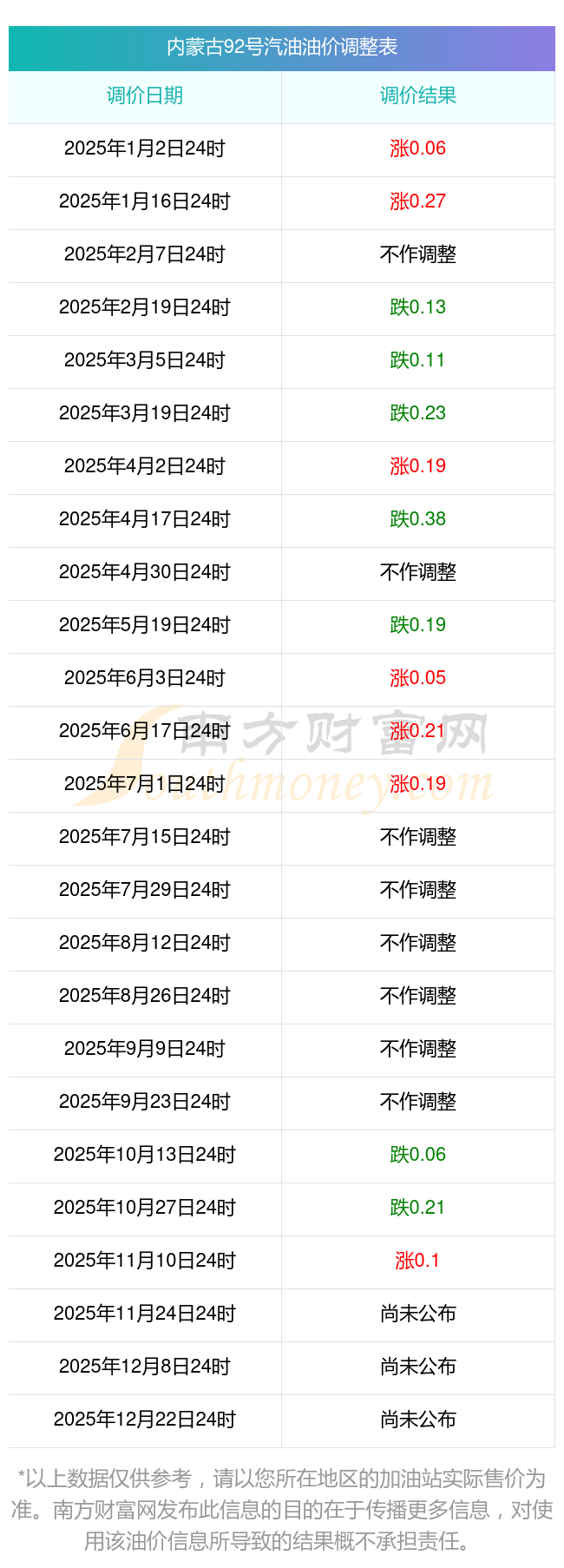 內(nèi)蒙古92號汽油油價調(diào)整表