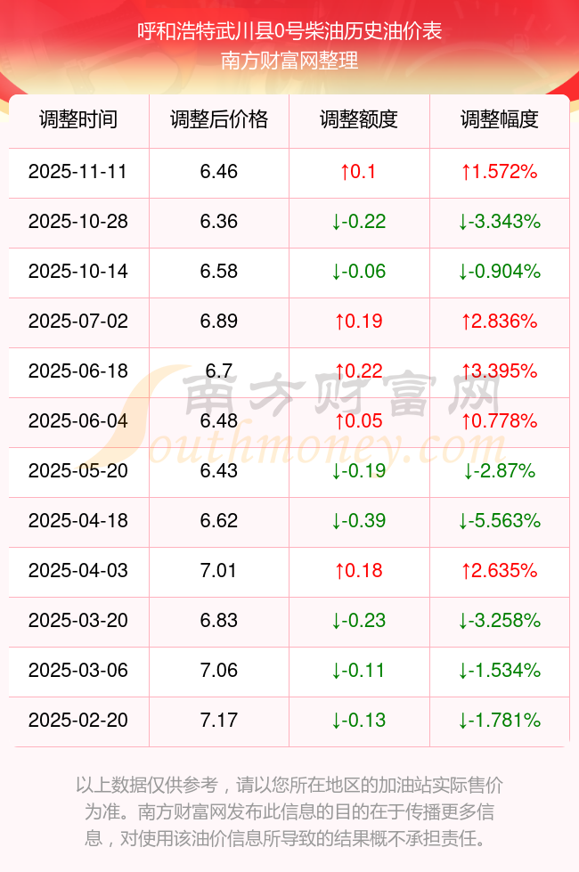 11月15日呼和浩特武川縣0號(hào)柴油歷史油價(jià)調(diào)整一覽表