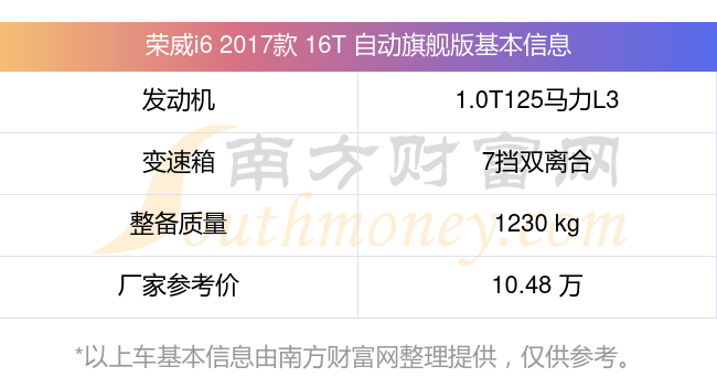 榮威i6 2017款 16T 自動(dòng)旗艦版動(dòng)力方面,搭載的是一臺(tái)1.0T125馬力L3渦輪增壓發(fā)動(dòng)機(jī),匹配7擋雙離合自動(dòng)檔變速箱,燃料形式為汽油,常規(guī)整備質(zhì)量1230kg,廠家參考價(jià)10.48萬元。