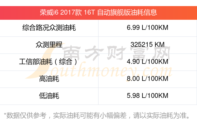 根據(jù)多位車主實(shí)測(cè)得出數(shù)據(jù),該車型低油耗為5.98L/100km,高油耗為8.00L/100km,綜合路況眾測(cè)油耗為6.99L/100km,工信部綜合油耗為4.90L/100km。