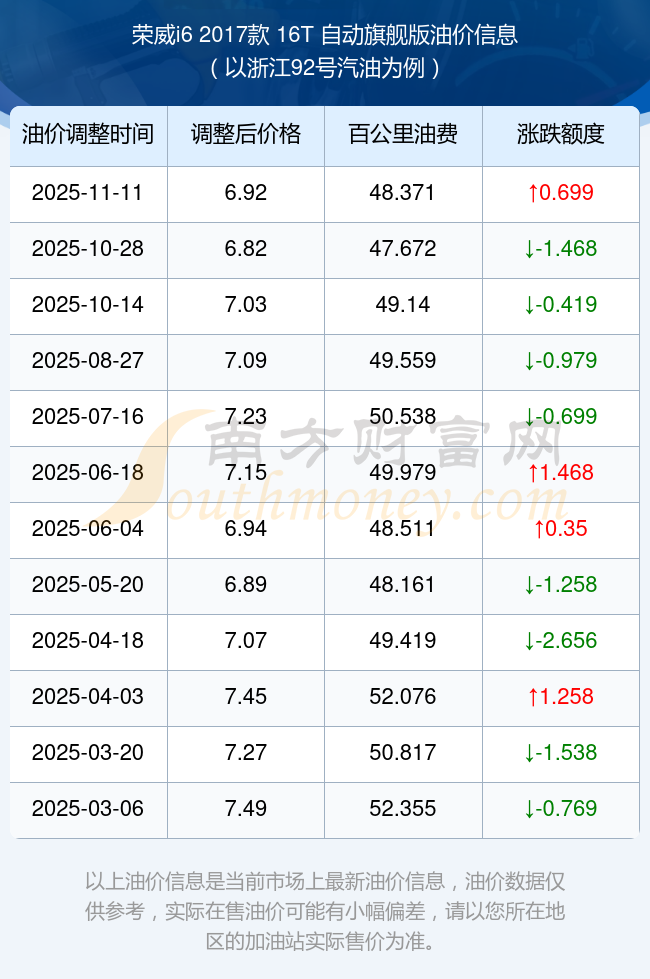 依照11月11日92號(hào)汽油最新調(diào)整價(jià)格6.92元/升來計(jì)算(以浙江為例),該車型百公里的平均油費(fèi)是48.371元,依照上一輪10月28日調(diào)整價(jià)格6.82元/升來計(jì)算,百公里的平均油費(fèi)是47.672元,對(duì)比上一輪多花0.699元,下一輪的油價(jià)調(diào)整時(shí)間11月24日24時(shí)。