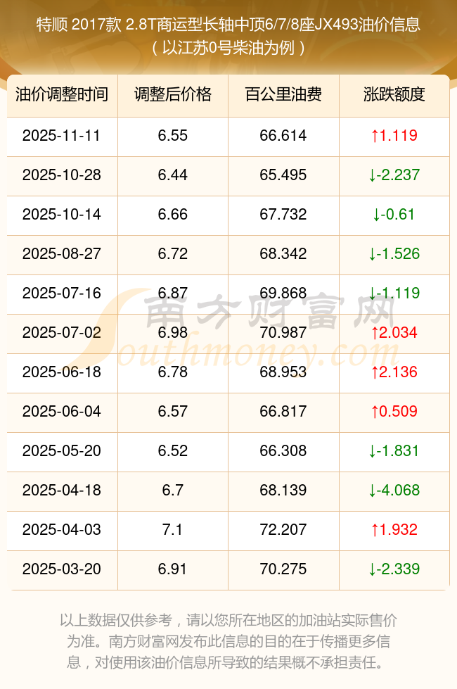 根據(jù)11月11日0號(hào)柴油最新調(diào)整價(jià)格6.55元/升來(lái)計(jì)算(以江蘇為例),該車型每百公里的平均油費(fèi)是66.614元,上一輪10月28日調(diào)整價(jià)格6.44元每升來(lái)計(jì)算,每百公里的平均油費(fèi)是65.495元,對(duì)比上一輪多花1.119元,下一輪的油價(jià)調(diào)整時(shí)間是11月24日24時(shí)。