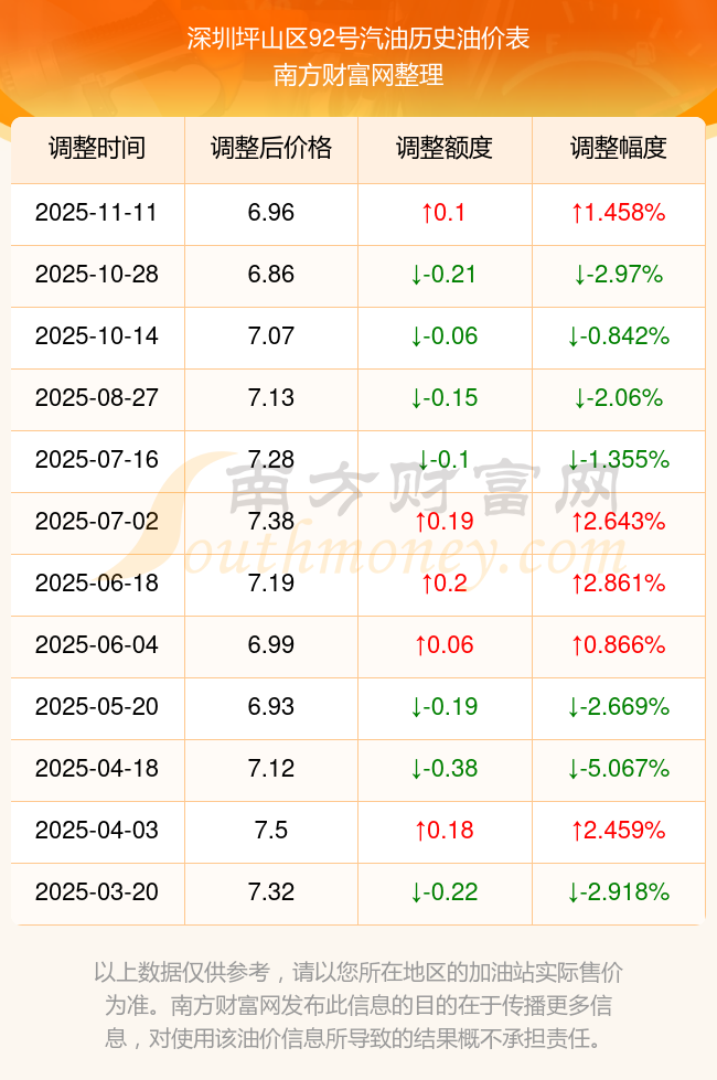 11月15日深圳坪山區(qū)92號(hào)汽油價(jià)格:6.96元每升,調(diào)整時(shí)間為11月11日,相對(duì)上次調(diào)整上調(diào)了0.1元。