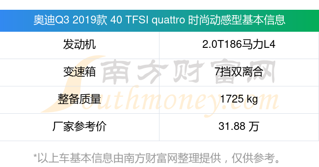 在動(dòng)力上,奧迪Q3 2019款 40 TFSI quattro 時(shí)尚動(dòng)感型配備的是一臺(tái)2.0T186馬力L4渦輪增壓發(fā)動(dòng)機(jī),匹配的是7擋雙離合自動(dòng)檔變速箱,燃料形式為汽油,常規(guī)整備質(zhì)量1725kg,廠家參考價(jià)31.88萬元。
