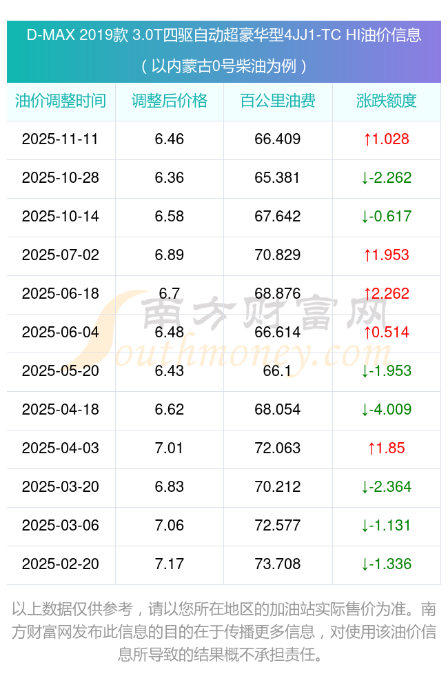 按照11月11日0號(hào)柴油最新調(diào)整價(jià)格6.46元/升來計(jì)算(以內(nèi)蒙古為例),該車型百公里平均油費(fèi)為66.409元,按照上一輪10月28日調(diào)整價(jià)格6.36元/升來計(jì)算,百公里平均油費(fèi)為65.381元,對(duì)比上一輪多花1.028元,下一輪油價(jià)調(diào)整時(shí)間為11月24日24時(shí)。