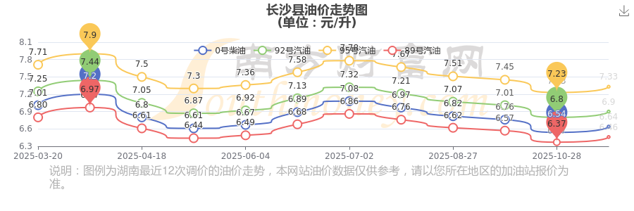 長沙縣汽油、柴油11月15日每升的價格(油價調(diào)整時間11月11日):92號汽油6.9元;95號汽油7.33元;89號汽油6.46元;0號柴油6.64元。