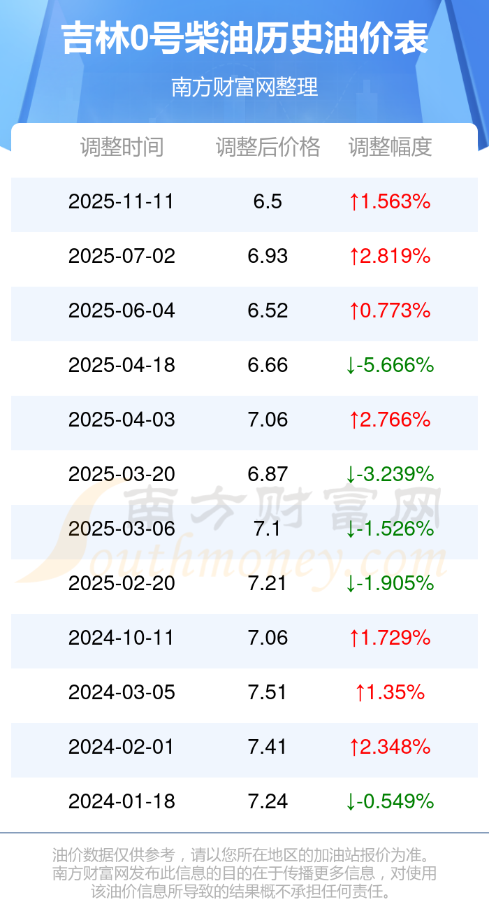11月15日吉林0號(hào)柴油價(jià)格為6.5元每升,本次調(diào)整時(shí)間為11月11日,相對(duì)上次調(diào)整后7月2日的油價(jià)6.4元每升,漲了0.1元,漲幅達(dá)1.563%。