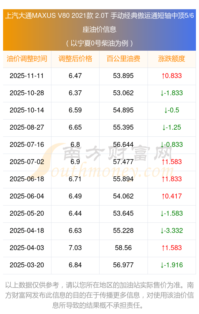 按11月11日0號柴油最新調(diào)整價格6.47元每升來計算(以寧夏為例),該車型百公里平均油費(fèi)為53.895元,按上一輪10月28日調(diào)整價格6.37元每升來計算,百公里平均油費(fèi)為53.062元,對比上一輪多花0.833元,下一輪油價調(diào)整時間為11月24日24時。