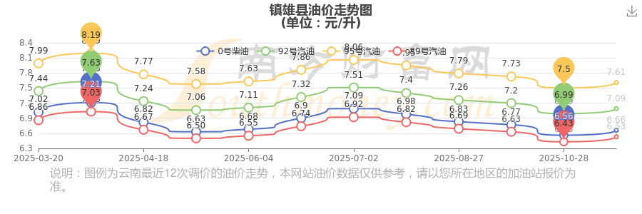 11月15日鎮(zhèn)雄縣汽油、柴油的價格是11月11日調整后的價格,每升價格為:92號汽油為7.09元,漲了0.1元,漲幅達1.43%;95號汽油為7.61元,漲了0.11元,漲幅達1.47%;89號汽油為6.53元,漲了0.1元,漲幅達1.56%;0號柴油為6.66元,漲了0.1元,漲幅達1.52%。