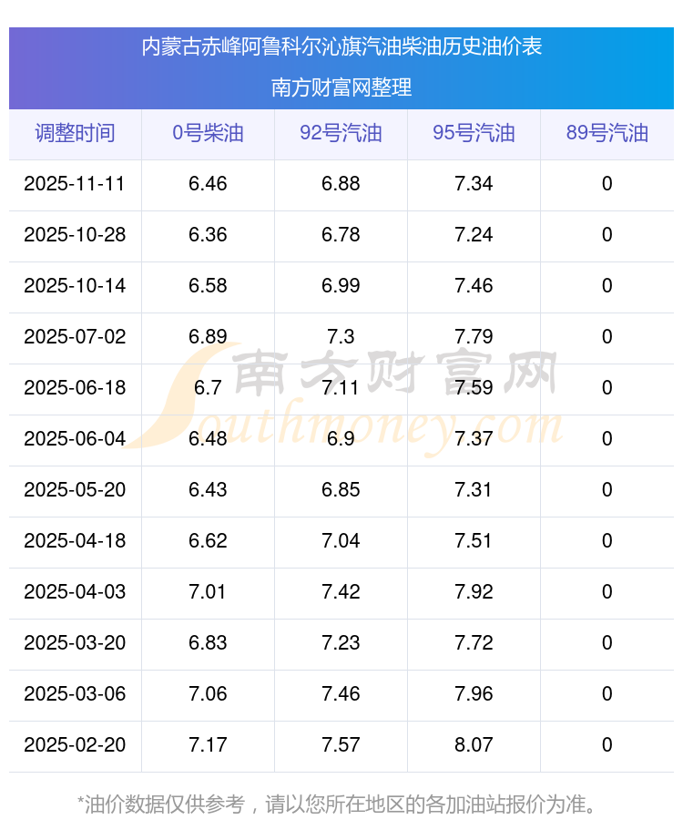 2025年內(nèi)蒙古赤峰阿魯科爾沁旗汽油價(jià)格一覽表