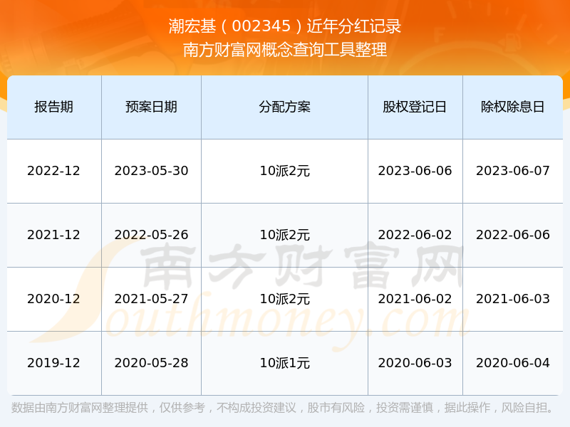 潮宏基最新一次公布的分紅方案為10派2元。本次權(quán)益分派股權(quán)登記日為2023年6月6日,除權(quán)除息日為2023年6月7日,派息日為2023年6月7日。