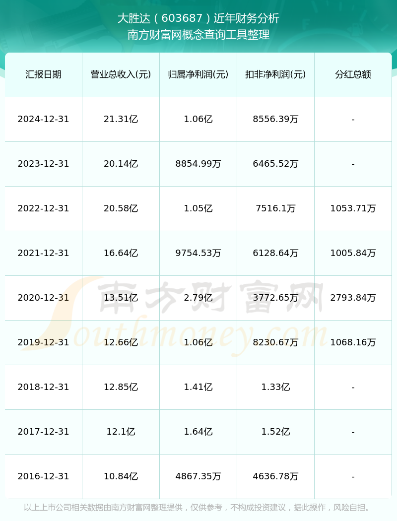 大勝達(dá)公司2024年實(shí)現(xiàn)營業(yè)收入21.31億元,同比增長5.84%;凈利潤1.06億元。