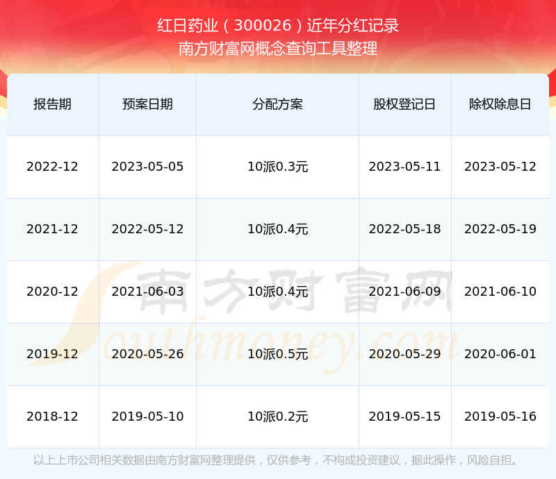 紅日藥業(yè)最新一次公布的分紅方案為10派0.3元。本次權益分派股權登記日為2023年5月11日,除權除息日為2023年5月12日,派息日為2023年5月12日。