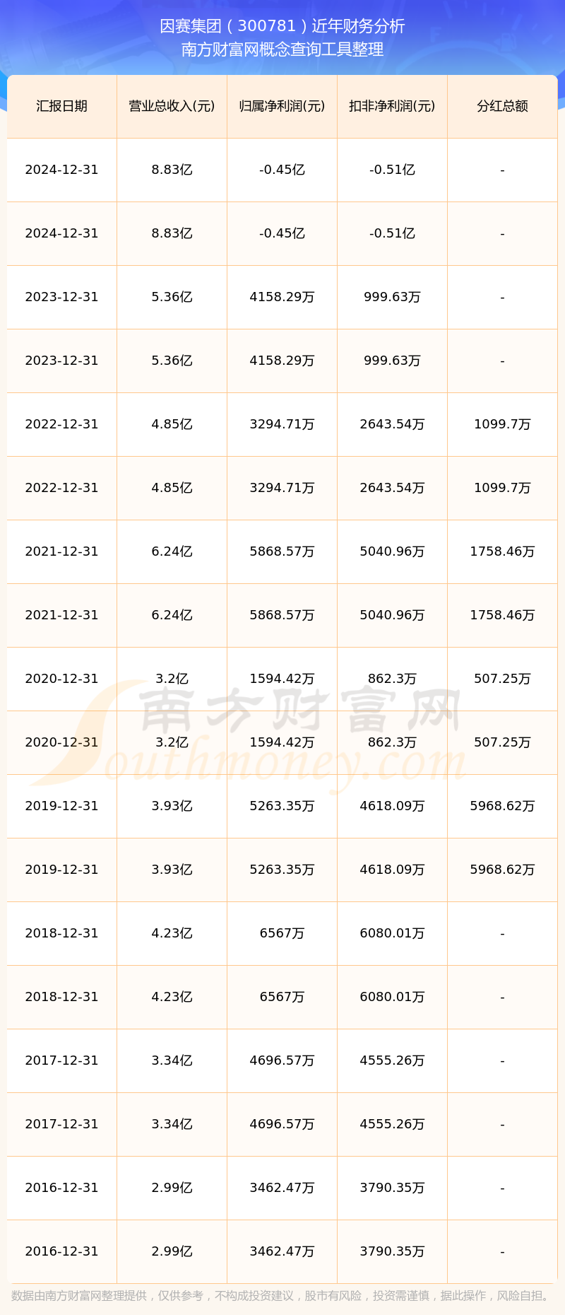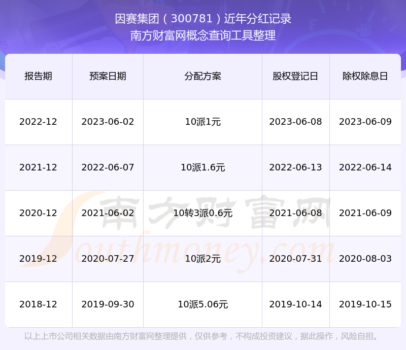 近年因賽集團(tuán)分紅派息情況如下表所示: