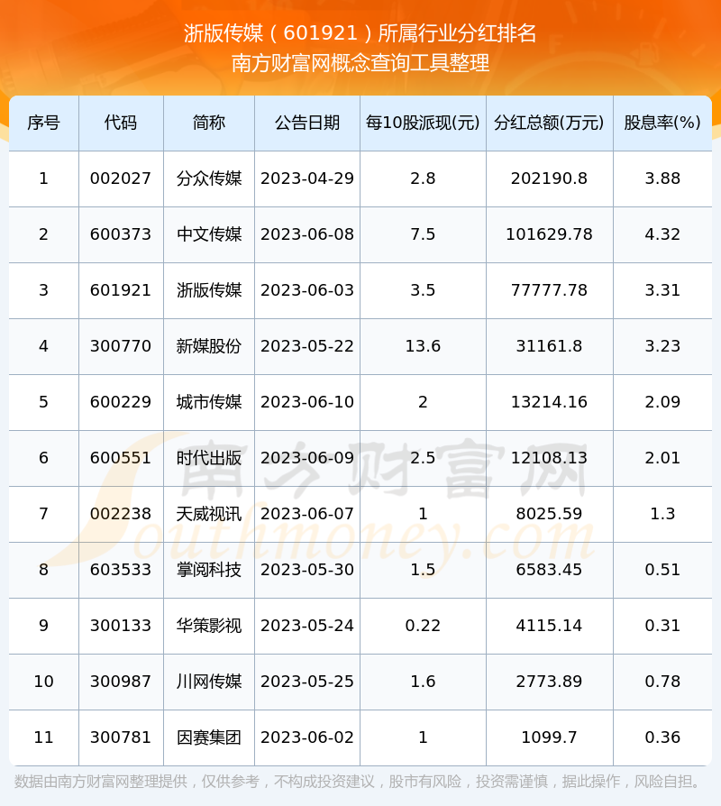按照南方財(cái)富網(wǎng)趨勢(shì)選股系統(tǒng)統(tǒng)計(jì),浙版?zhèn)髅剿鶎傩袠I(yè)為文化傳媒行業(yè),文化傳媒行業(yè)分紅排名情況如下表: