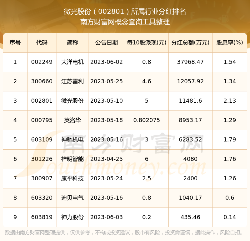 按照南方財富網(wǎng)趨勢選股系統(tǒng)統(tǒng)計,微光股份所屬行業(yè)為外轉(zhuǎn)子風(fēng)機行業(yè),外轉(zhuǎn)子風(fēng)機行業(yè)分紅排名情況如下表: