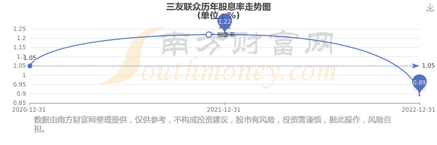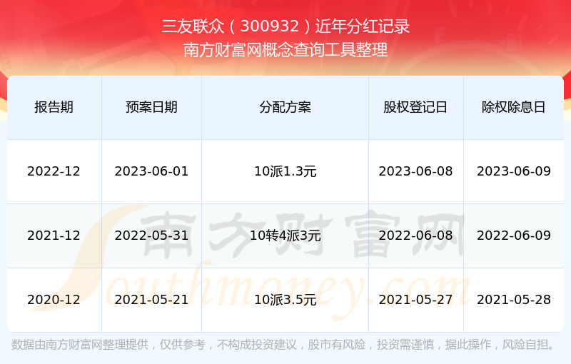 三友聯眾最新一次公布的分紅方案為10派1.3元。本次權益分派股權登記日為2023年6月8日,除權除息日為2023年6月9日,派息日為2023年6月9日。