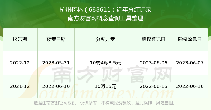 杭州柯林最新一次公布的分紅方案為10轉4派3.5元。本次權益分派股權登記日為2023年6月6日,除權除息日為2023年6月7日,派息日為2023年6月7日。
